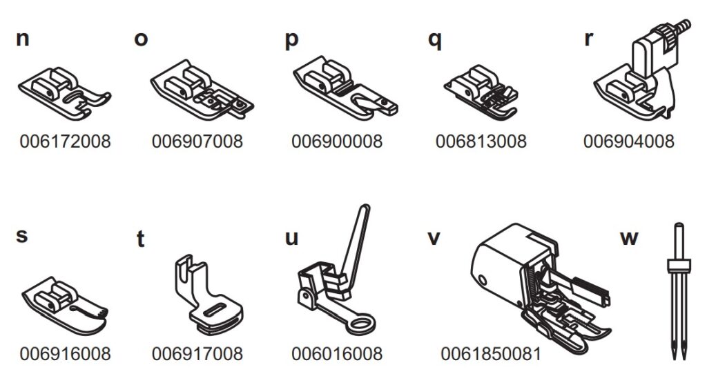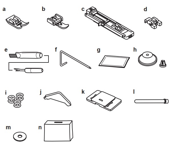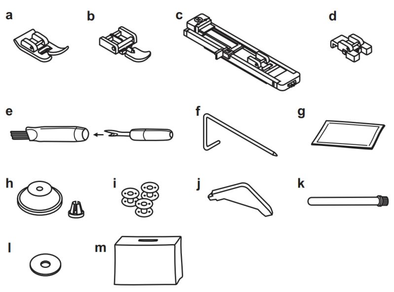- 9 paininjalkaa (yleisjalka, vetoketjujalka, napinläpijalka, napinompelujalka, Easy sew- jalka, huolittelujalka, piilo-ommeljalka, luistojalka, suoraommeljalka)