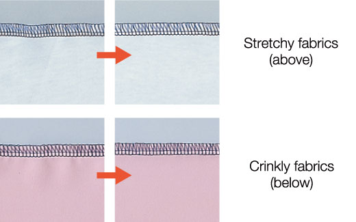 Jopa helposti venyvien kankaiden kanssa, voit luoda kauniisti ommeltuja viimeistelyjä säätämällä differentiaalisyöttöä. Säätöjä voidaan tehdä jopa ompelun aikana