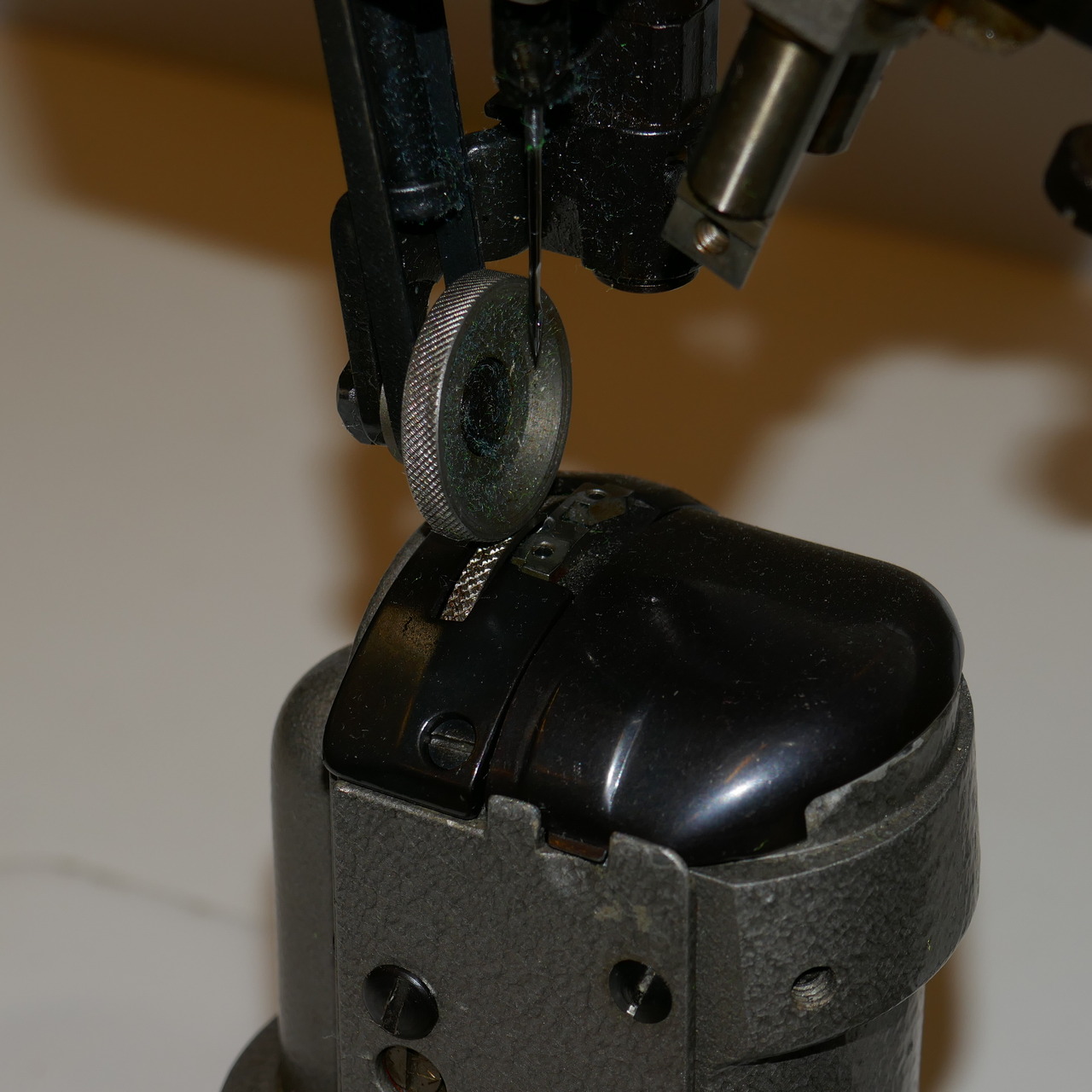 Yksineulainen tolppaompelukone ylä- ja alasyötöllä ja ohkaisella pylväällä. Rullasyötön ansiosta, soveltuu parhaiten nahan ompeluun.