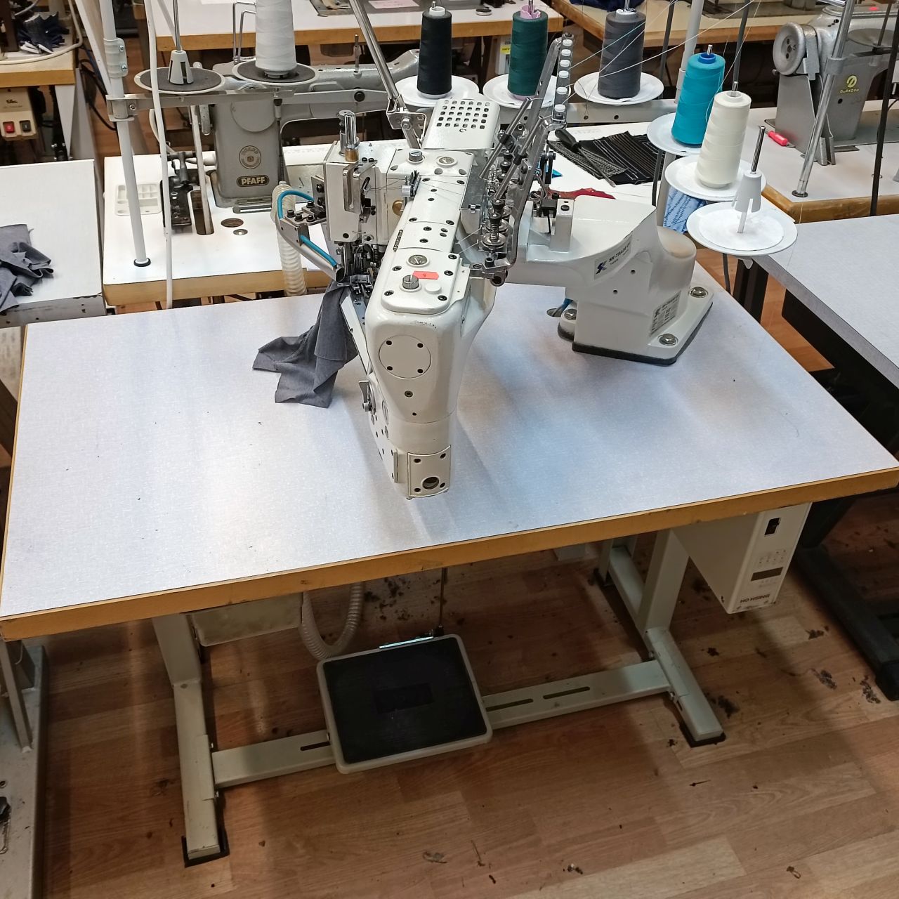 5-needle, 6-thread, high speed feed off the arm, interlock flatseaming machine (table model) with double edge fabric trimmer, suitable for light to medium work. Machine is equipped with direct drive Ho Hsing mini motor, Venturi device and pneumatic presser foot lifter.