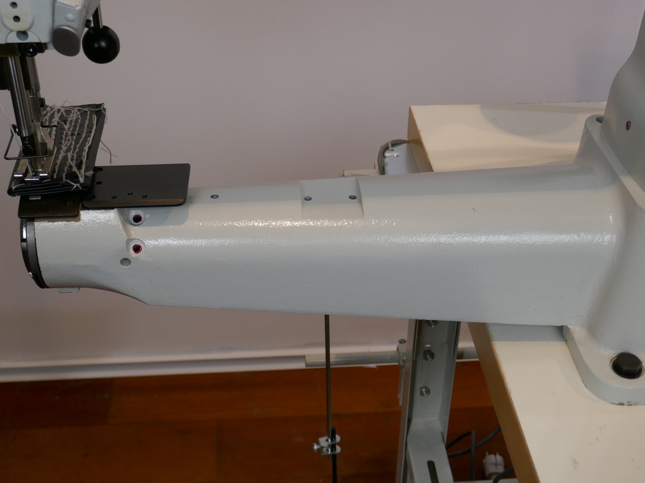 Heavy duty compound feed cylinder sewing machine with quite servo, free arm and thread trim.