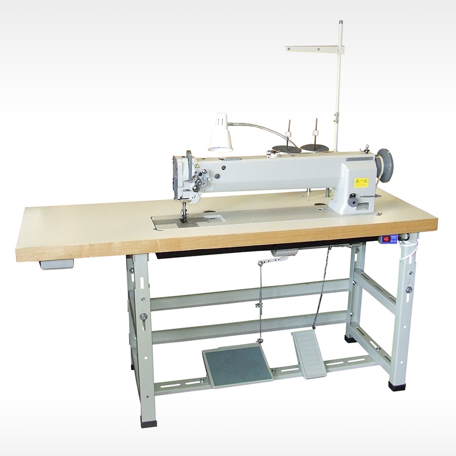 Long arm compound feed industrial machine with automatic thread trimmer, servo motor, large horizontal hook and long stitch length.
