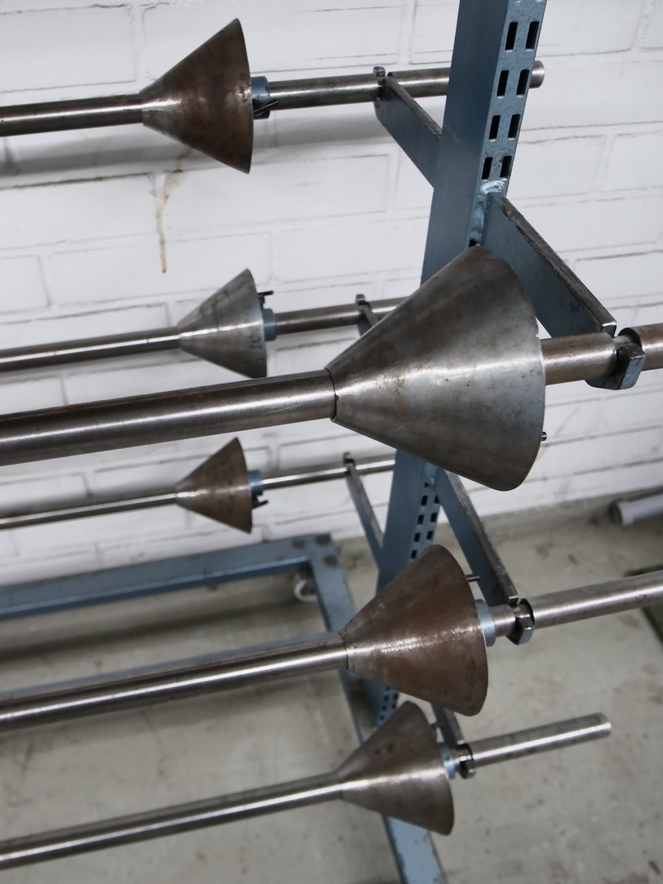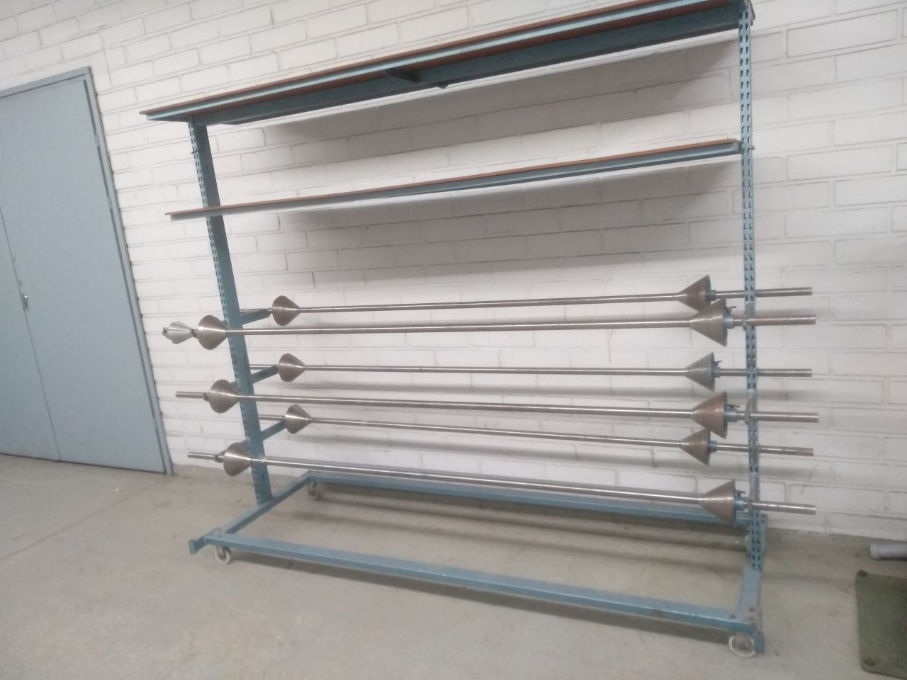 Kenkäteollisuudessa käytetty siirrettävä kangaspakka-/kangasrullateline pyörillä. Sisältää 6kpl kangasrullatankoa kiinnityskartioineen. Tähän telineeseen kuuluu myös syöttäjä ID: #NKS-091.