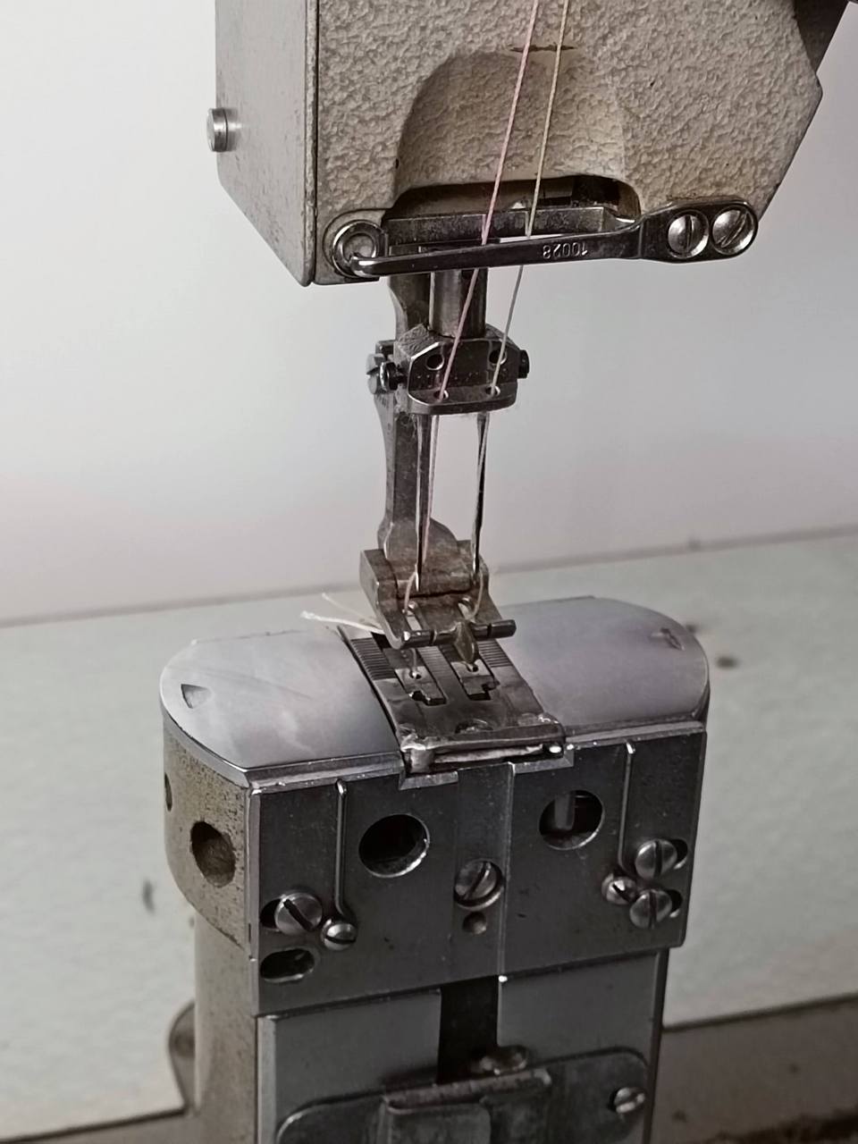 Kaksineulainen tolppaompelukone pylväällä. Varustettu peruutuksella ja paininjalan polvinostimella.