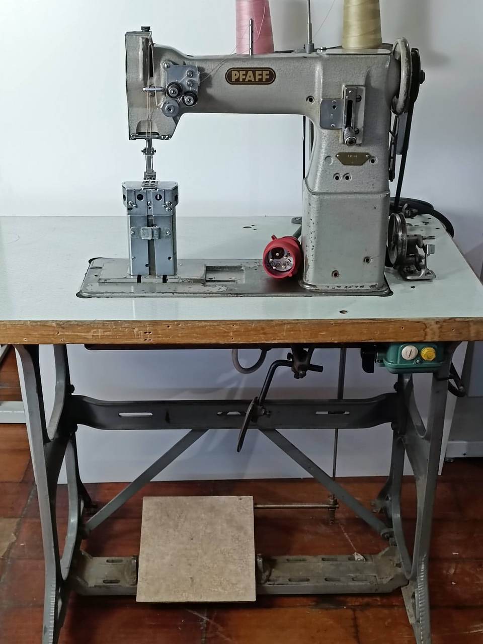 Two-needle post bed sewing machine with a bar. Equipped with reverse and presser foot knee lift.