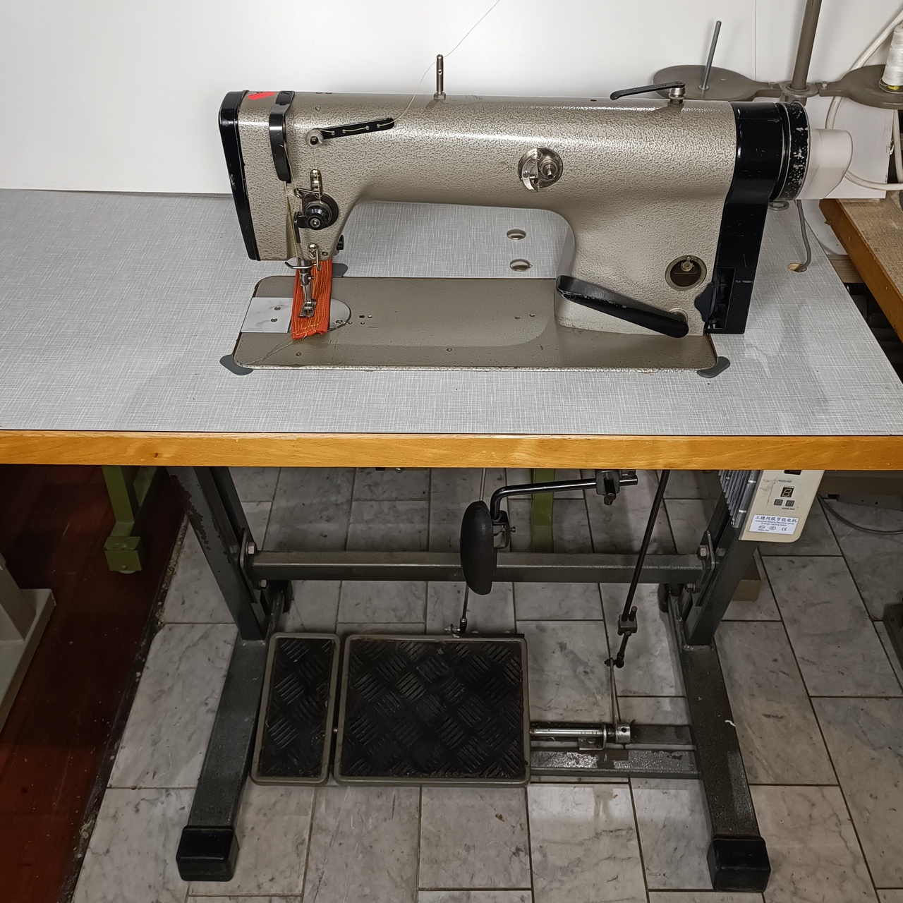 Needle feed sewing machine equipped with a silent 230V servo motor and needle stop.
