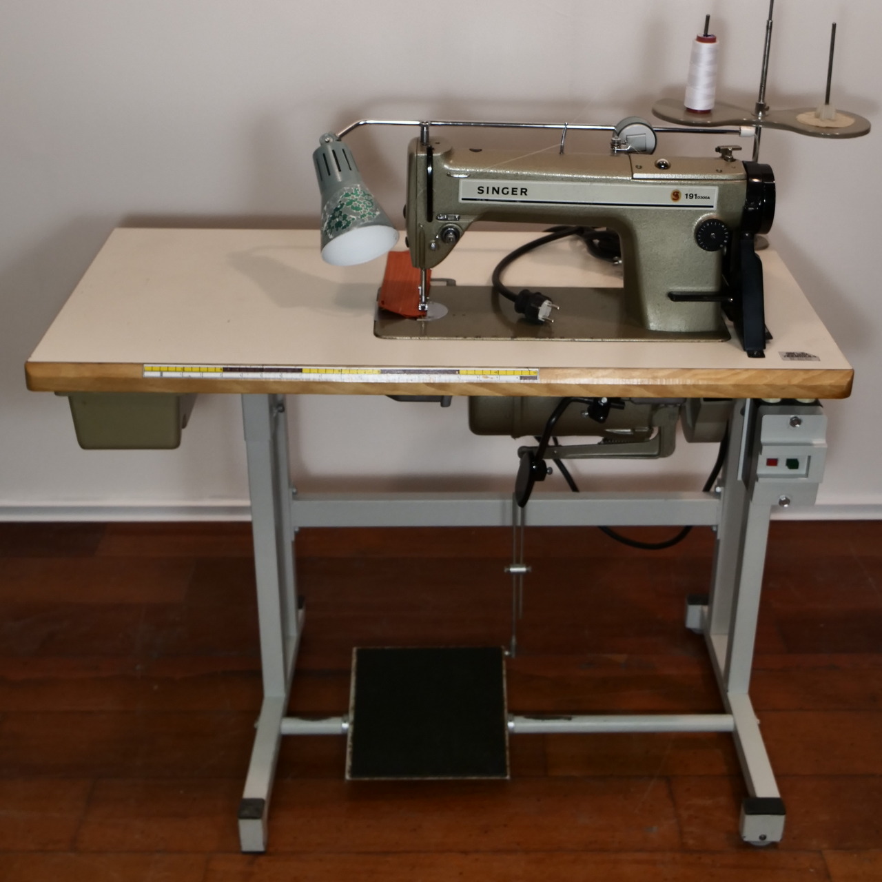 Single phase current 230V single feed sewing machine with table.