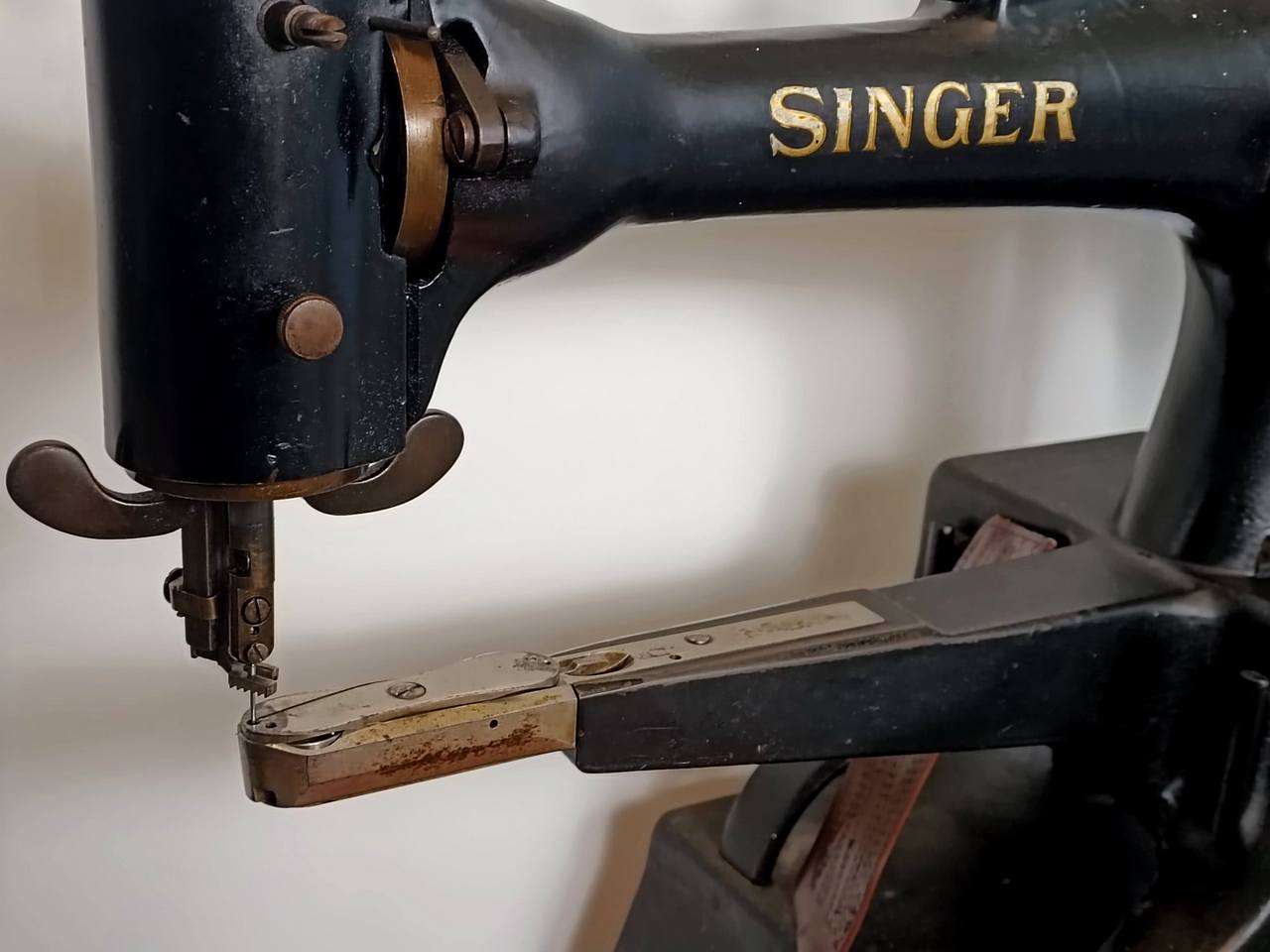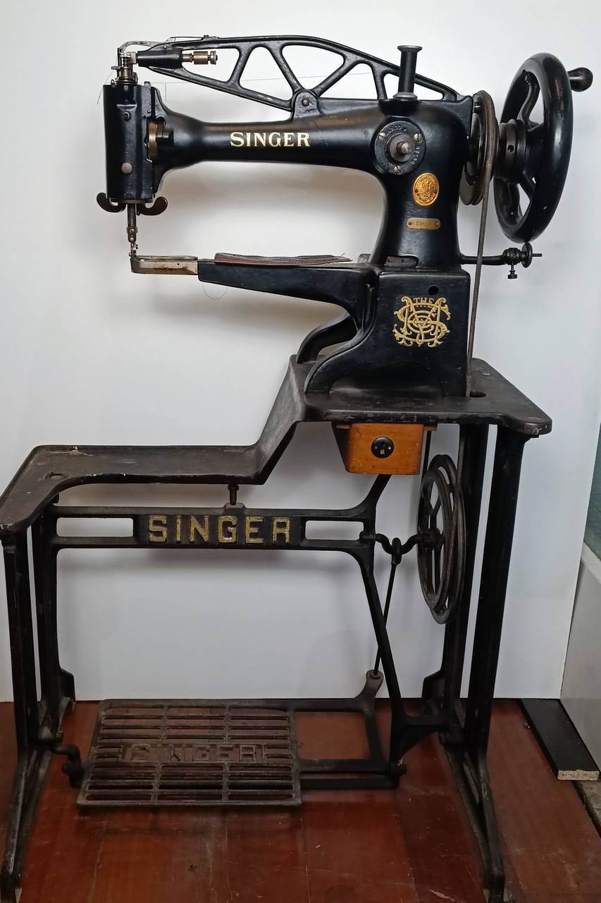 Shoemaker machine with free arm for sewing shoes and other leather garments.